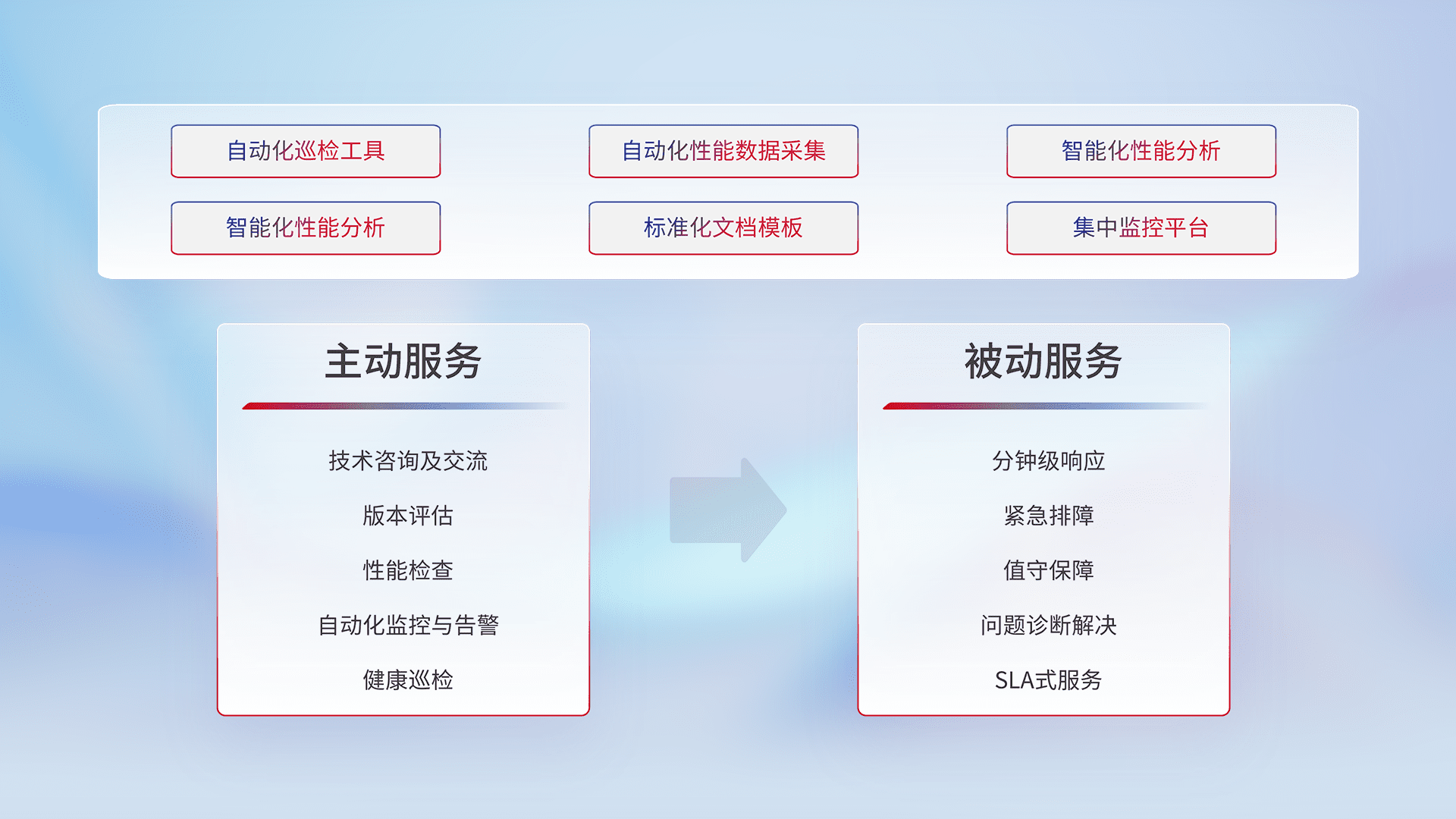 智能化工具和标准化文档,,,,保障服务质量,,,,提供主动服务(包含技术咨询、、、、版本评估、、、、性能检查、、、自动化监控与告警、、、健康巡检)和被动服务包含(分钟级响应、、、紧急排障、、、值守保障、、问题诊断解决、、SLA服务)。。